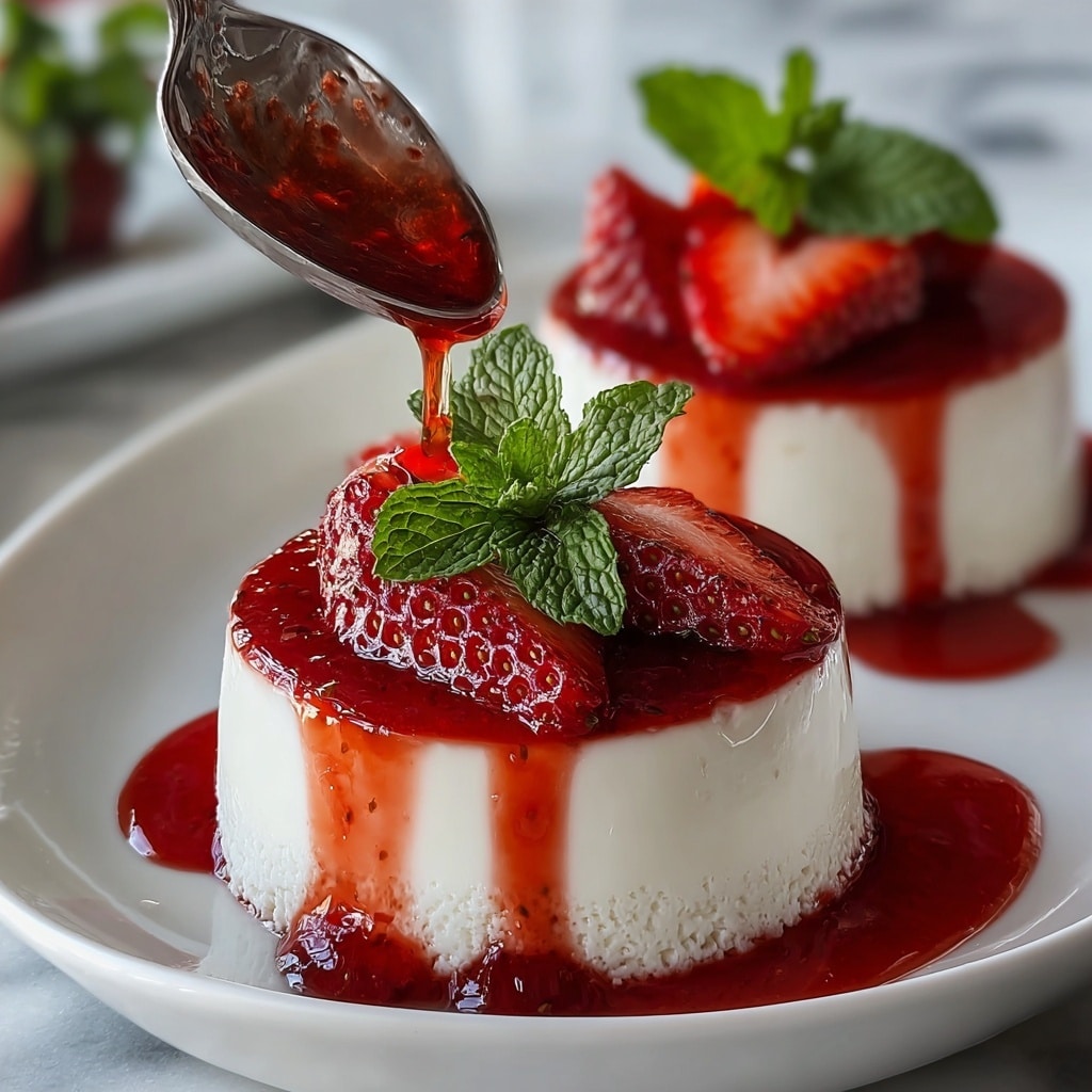 - Plate and Garnish: Spoon the cooled strawberry sauce generously over each set panna cotta. Garnish with fresh sliced strawberries and mint leaves for a beautiful presentation.