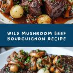 A classic French Wild Mushroom Beef Bourguignon featuring tender braised beef chuck simmered in red wine with aromatic vegetables, wild mushrooms, and pearl onions. This hearty and flavorful dish is perfected by slow cooking in the oven, creating a rich sauce and melt-in-your-mouth meat that’s ideal for special occasions or comforting dinners.